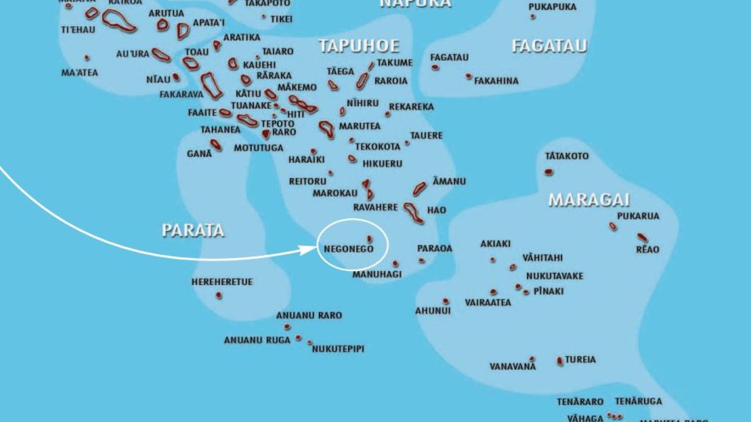 Atolls des Tuamotu dans leur graphie pa’umotu. Nengo Nengo est situé au sud de Ravahere.Nengo Nengo vu du ciel. Une mince bande de sable au cœur du plus grand océan du monde, le projet d’une vie.